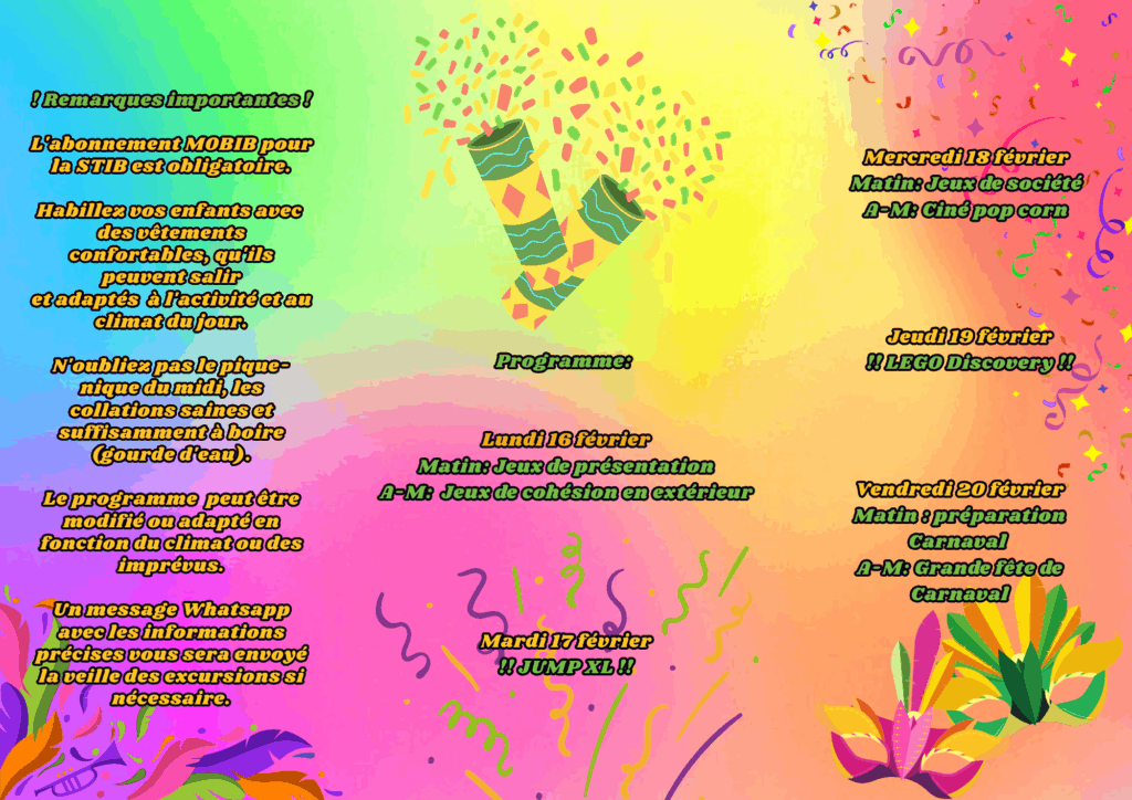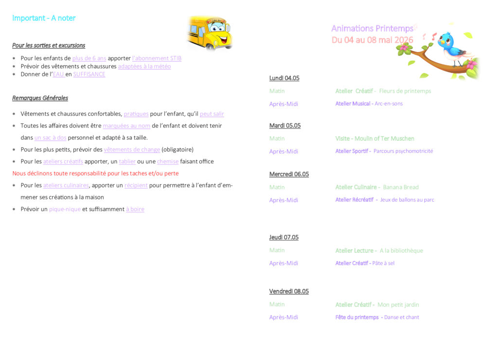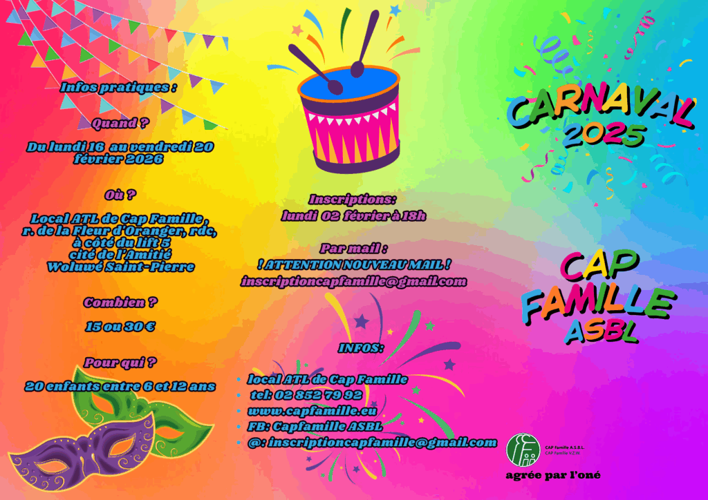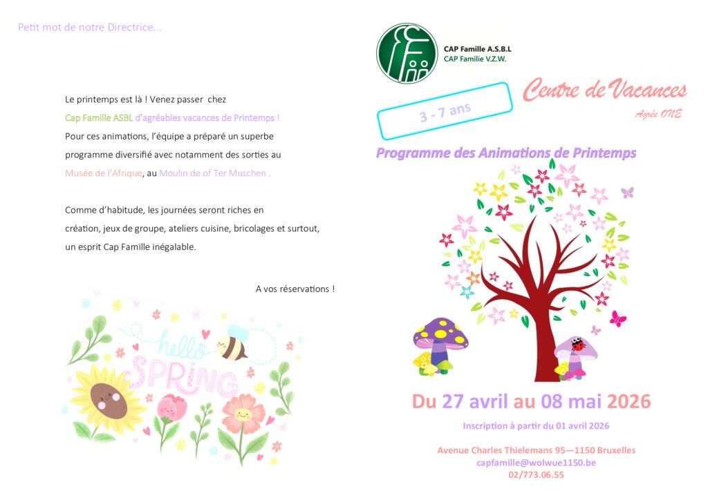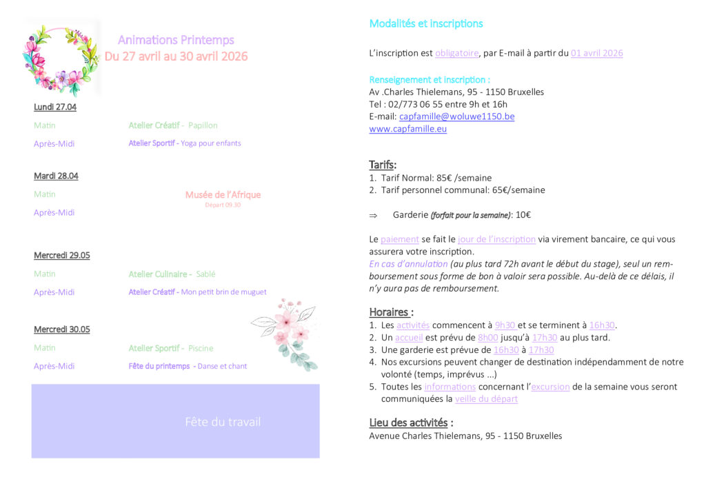 Pour les renseignements, prenez contact avec Amandine au 02/852 79 92 ou capfamille.edd@gmail.com